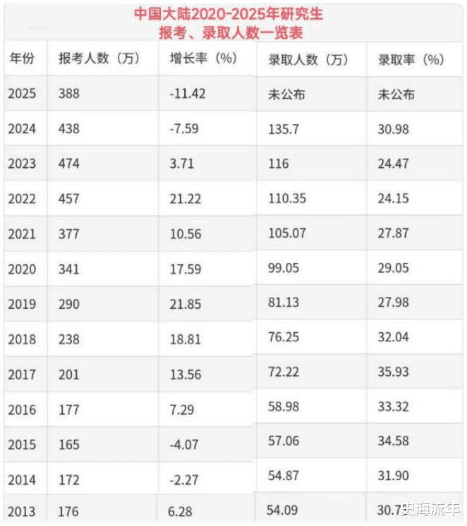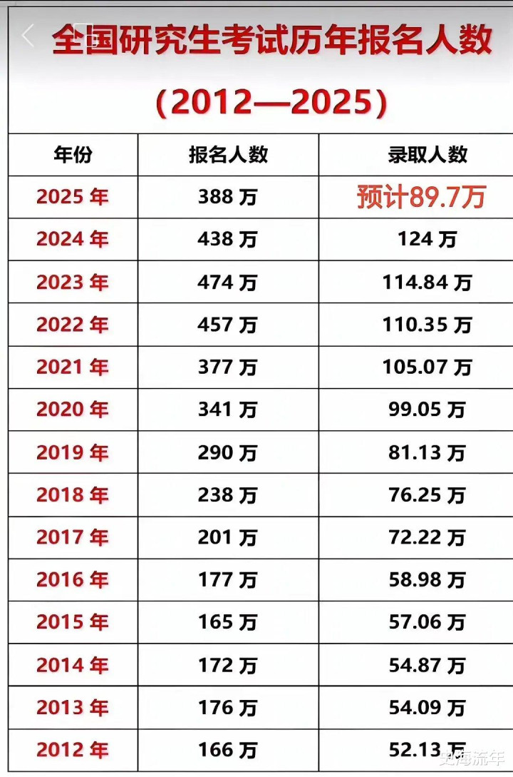 2020年至2023年,全国考研报名人数完成了从341万到474万的“三级跳”,年均增幅超10%,疫情引发的“就业避险”需求与学历通胀焦虑共同催生了考研狂热。但转折点自2024年出现,因为报考人数骤降36万至438万,2025年再降50万至388万,两年累计降幅达18.1%。
